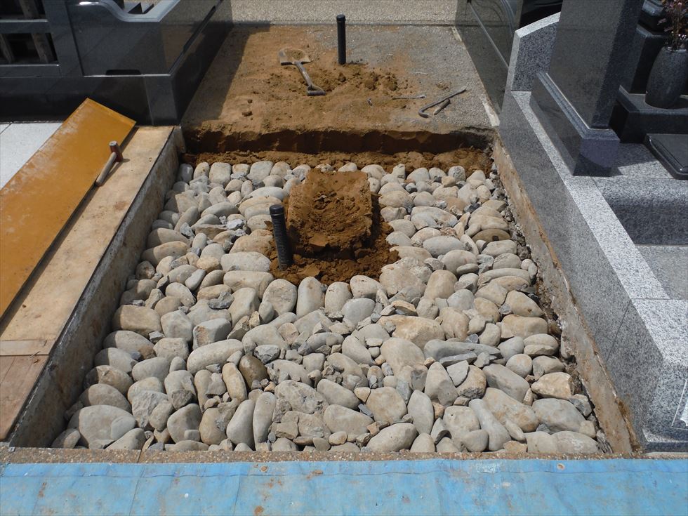 お墓の中に湿気などで発生した水分などが溜まることなく、地面へ抜けるようにするために水抜きもこの時、同時に配置します。