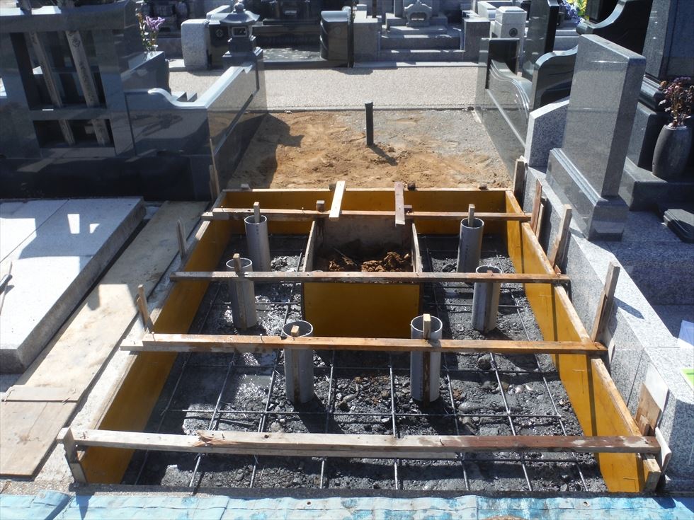 基礎の立ち上がりと納骨室の型枠をつくり型枠を組んでいきます。型枠組みが完成したら鉄筋を配筋し固定結束していきます。