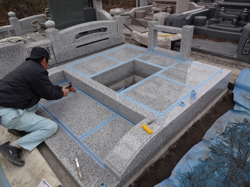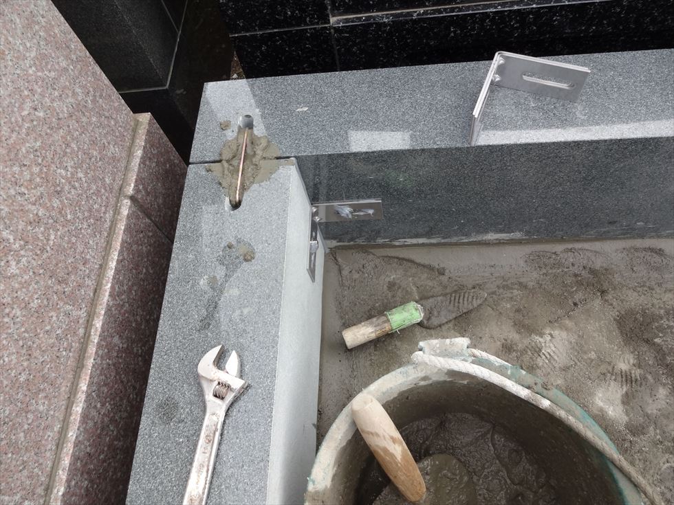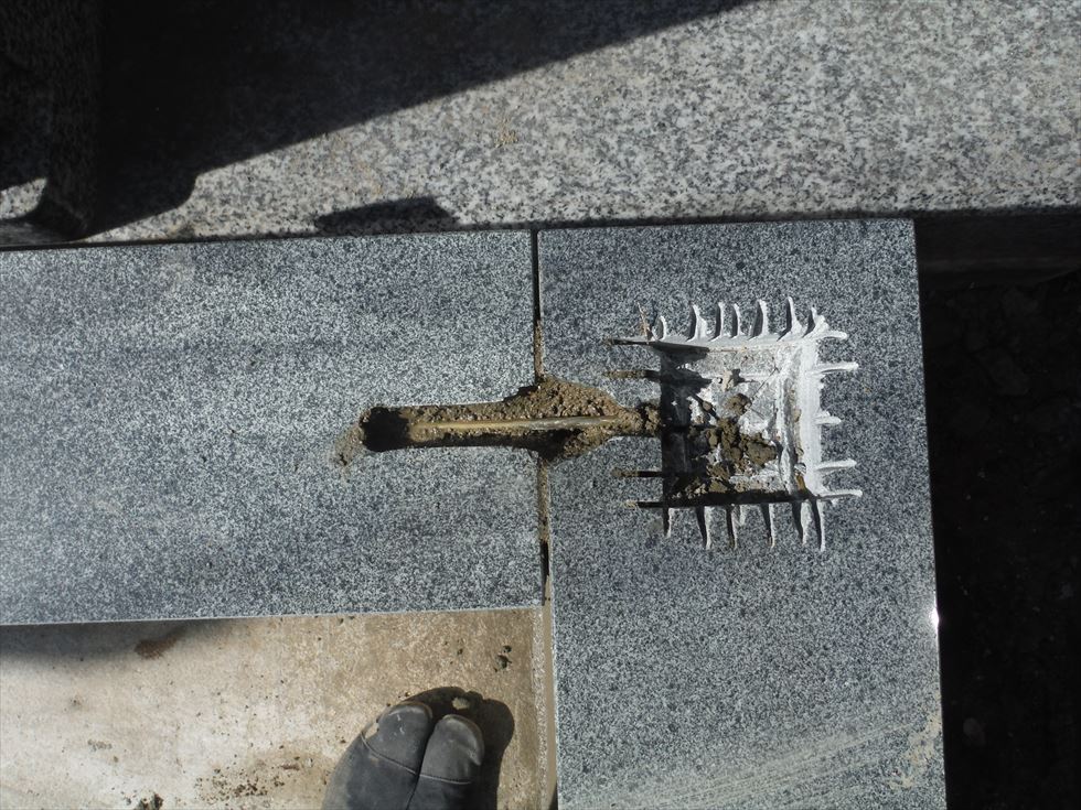 接合力を高めるために、石の合わせ目(合口)に切れ込み等を入れセメント・ボンド・コーキングを使用し、据え付けを行っております。